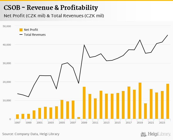 Comparing CSOB with its closest peers, Ceska Sporitelna generated a net profit of CZK 26,238 mil with revenues of CZK 56,486 mil in 2024 and Komercni Banka netted CZK 17,408 mil (revenues of CZK 36,786 mil).