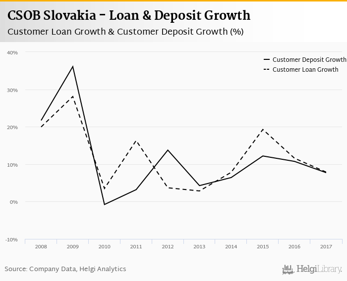 CSOB Slovakia's customer loan growth reached 7.87% in 2017, down from 11.6% compared to the previous year. Historically, the bank’s loans growth reached an all time high of 28.1% in 2009 and an all time low of 2.84% in 2013. In the last decade, the average annual loan growth amounted to 0%.