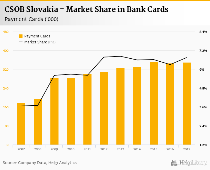 CSOB Slovakia therefore accounted for 6.74% of all bank cards issued by banks in Slovakia at the end of 2017. Historically, the bank’s market share in payment cards reached an all time high of 6.82% in 2013 and an all time low of 3.69% in 2008.