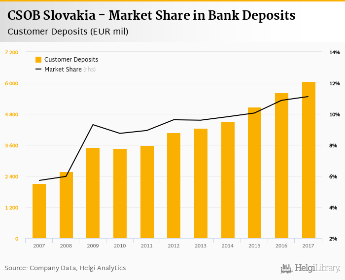 CSOB Slovakia accounted for 11.1% of all customer deposits taken by banks in Slovakia at the end of 2017. Historically, the bank’s market share in customer deposits reached an all time high of 11.1% in 2017 and an all time low of 5.71% in 2007.