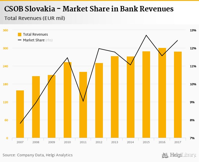 As a result, CSOB Slovakia accounted for 12.4% of all bank revenues generated by banks in Slovakia in 2017. Historically, the bank’s market share in total revenues reached an all time high of 12.7% in 2015 and an all time low of 7.79% in 2007.