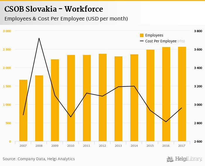 Comparing CSOB Slovakia with its closest peers, VUB Banka had 3,942 employees and 236 branches in 2017, Slovenska Sporitelna operated with 4,250 people and 271 branches and Tatra banka had a network of 187 branches with 3,754 employees in 2017.