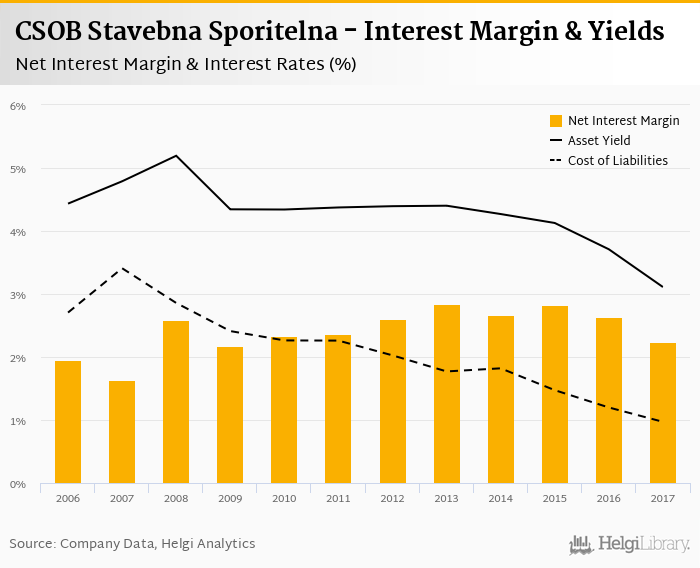 Comparing CSOB Stavebna Sporitelna with its closest peers, Wustenrot Stavebna Sporitelna operated in 2017 with a net interest margin of 2.22% in 2017, Prva Stavebna Sporitelna reached 1.95% and Tatra banka some 2.27%.