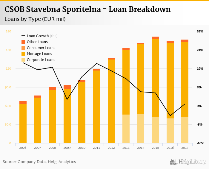 CSOB Stavebna Sporitelna's loans reached EUR 167 mil in the 2017, up from EUR 165 mil compared to the previous year. Historically, the bank’s loans reached an all time high of EUR 172 mil in 2015 and an all time low of EUR 68.5 mil in 2006.