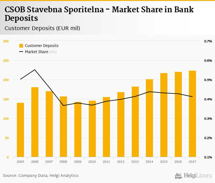 CSOB Stavebna Sporitelna accounted for 0.411% of all customer deposits taken by banks in Slovakia at the end of 2017. Historically, the bank’s market share in customer deposits reached an all time high of 0.551% in 2006 and an all time low of 0.365% in 2008.