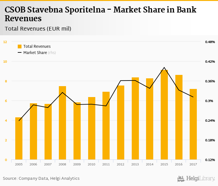 As a result, CSOB Stavebna Sporitelna accounted for 0.310% of all bank revenues generated by banks in Slovakia in 2017. Historically, the bank’s market share in total revenues reached an all time high of 0.401% in 2015 and an all time low of 0.238% in 2005.