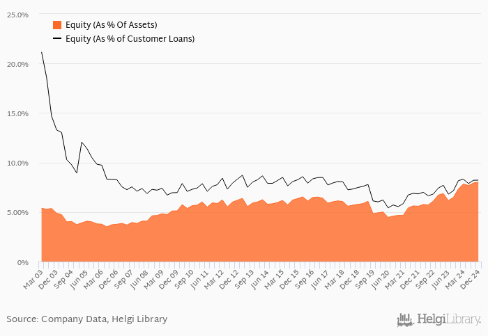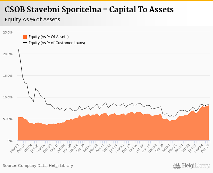 CSOB Stavebni Sporitelna's Equity reached 8.02% of total assets in the 4Q2024, up from 7.34% for the previous year. As a share of net customer loans, the ratio amounted to 8.22% at the end of the fourth quarter of 2024.
