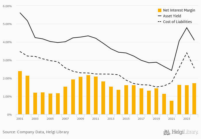 Historically, the bank’s net interest margin reached an all time high of 2.40% in 2001 and an all time low of 0.758% in 2021. The average margin in the last five years amounted to 1.38%.