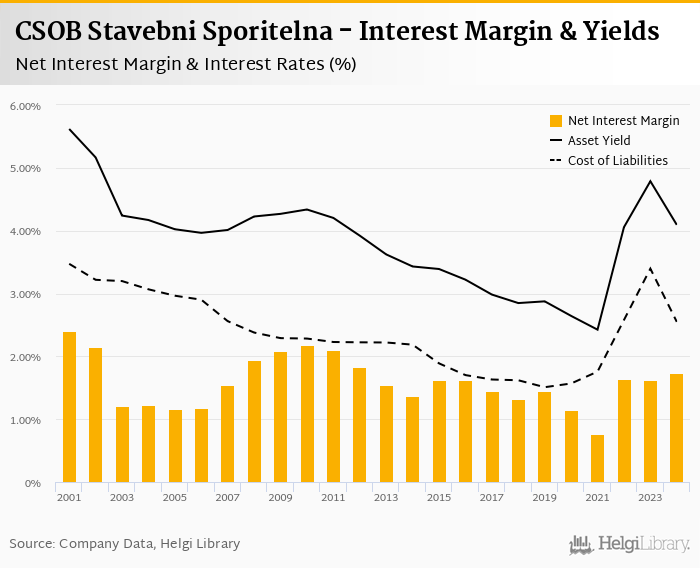 CSOB Stavebni Sporitelna's net interest margin amounted to 1.74% in 2024, up from 1.63% compared to the previous year.