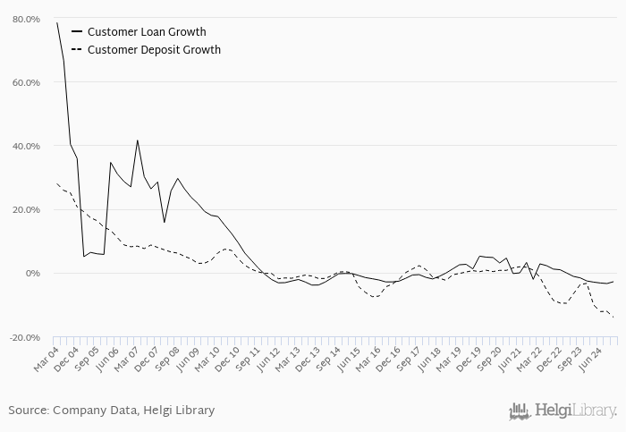 On the other hand, bank's customer deposit growth amounted to -14.1% at the end of 2024-12-31, down from -3.37% when compared to the previous year. Historically, the bank’s deposit growth reached an all time high of 27.9% in 2004-03-31 and an all time low of -14.1% in 2024-12-31. In the last decade, the average annual loan growth amounted to -3.58%.