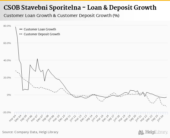 CSOB Stavebni Sporitelna's customer loan growth reached -2.83% in 2024-12-31, down from -2.62% compared to the previous year. Historically, the bank’s loans growth reached an all time high of 78.5% in 2004-03-31 and an all time low of -3.92% in 2013-09-30. In the last decade, the average annual loan growth amounted to -0.226%.