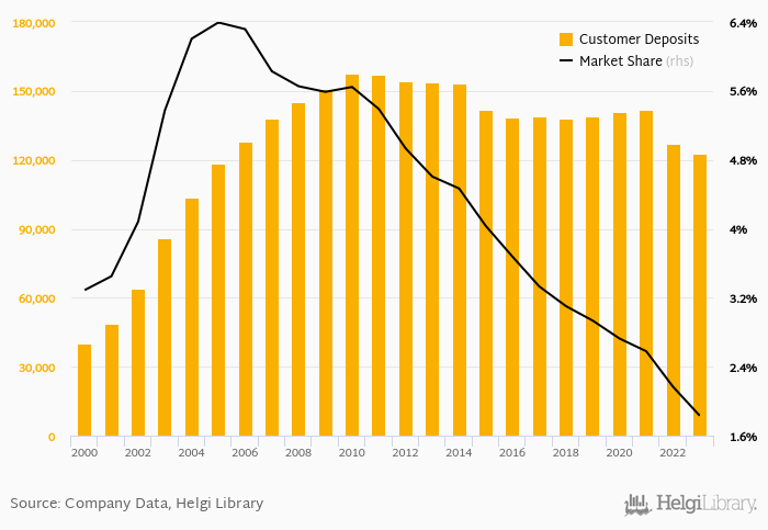 CSOB Stavebni Sporitelna accounted for 1.83% of all customer deposits taken by banks in Czechia at the end of 2023. Historically, the bank’s market share in customer deposits reached an all time high of 6.39% in 2005 and an all time low of 1.83% in 2023.