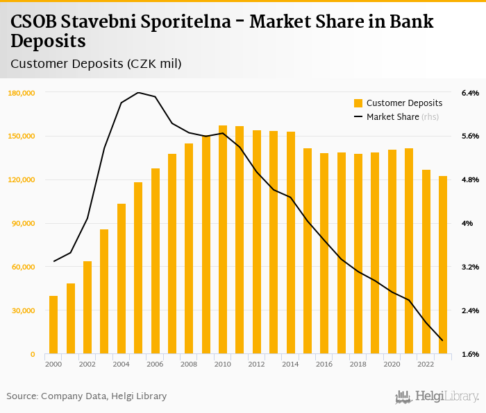 CSOB Stavebni Sporitelna's customer deposits reached CZK 122,698 mil in 2023, down 3.37% compared to the previous year.