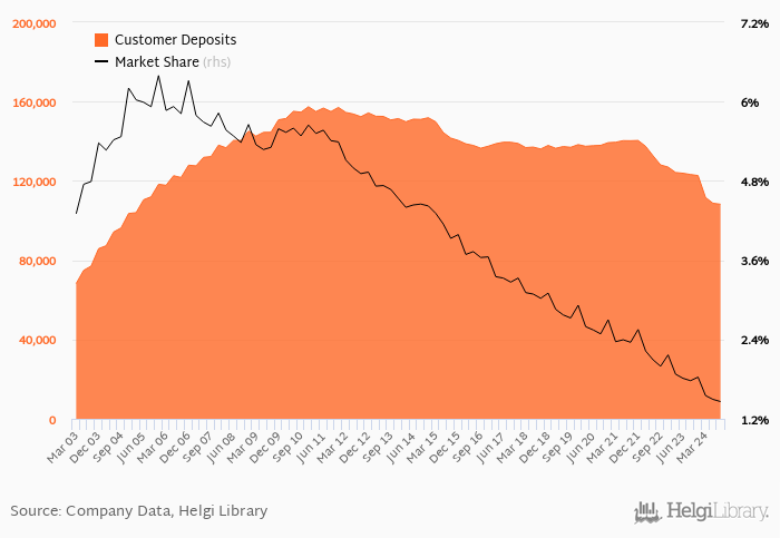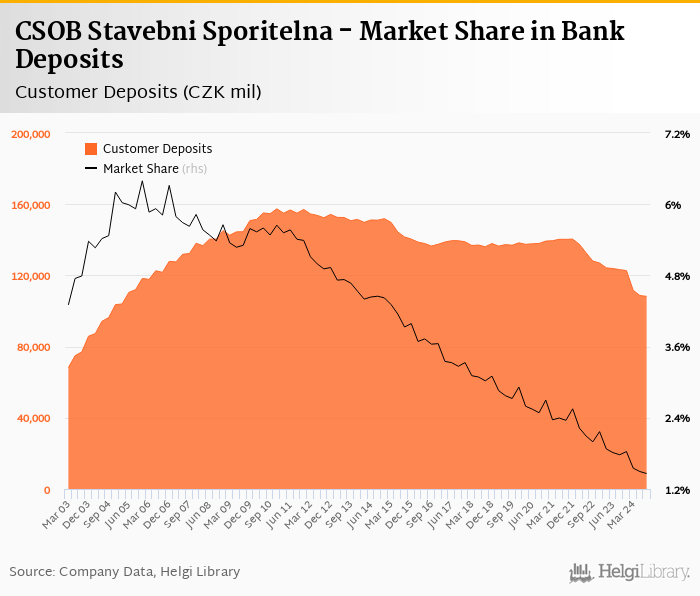 CSOB Stavebni Sporitelna accounted for 1.46% of all customer deposits taken by banks in Czechia at the end of 2024-09-30. Historically, the bank’s market share in customer deposits reached an all time high of 6.39% in 2005-12-31 and an all time low of 1.46% in 2024-09-30.