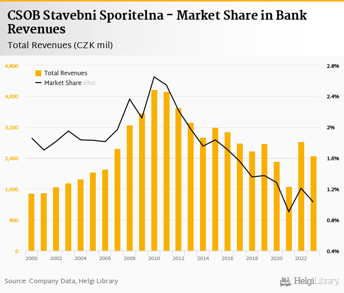 CSOB Stavebni Sporitelna generated total banking revenues of CZK 2,460 mil in 2023, down 13.0% compared to the previous year.