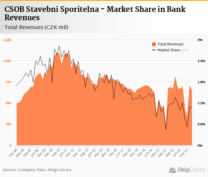 As a result, CSOB Stavebni Sporitelna accounted for 1.08% of all bank revenues generated by banks in Czechia in 2024-09-30. Historically, the bank’s market share in total revenues reached an all time high of 2.82% in 2010-09-30 and an all time low of 0.432% in 2021-12-31.