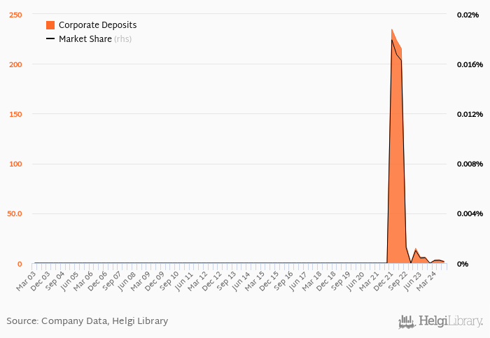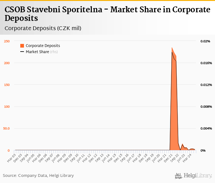 CSOB Stavebni Sporitelna accounted for < 0.001% of all corporate deposits taken by banks in Czechia at the end of 2024-09-30. Historically, the bank’s market share in corporate deposits reached an all time high of 0.018% in 2021-12-31 and an all time low of 0% in 2003-03-31.