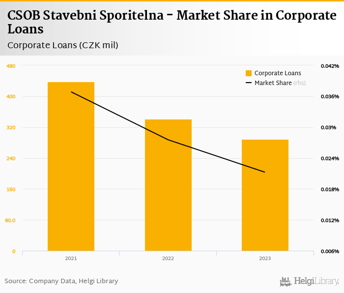 CSOB Stavebni Sporitelna's corporate loans reached CZK 288 mil in 2023, down 15.4% compared to the previous year.