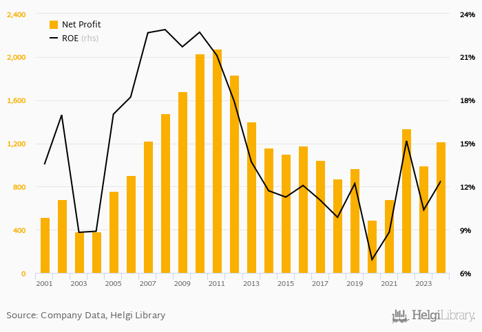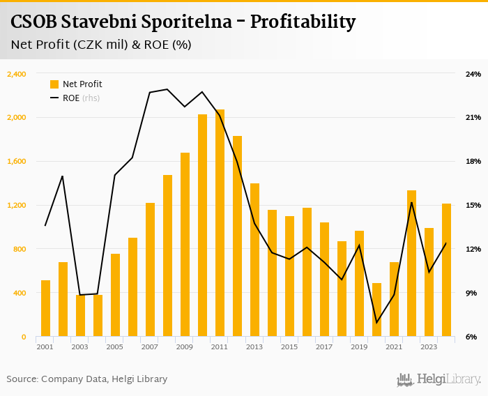 CSOB Stavebni Sporitelna made a net profit of CZK 1,213 mil in 2024, up 22.2% compared to the previous year. This implies a return on equity of 12.4%.