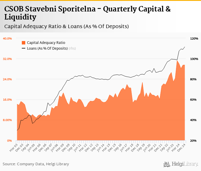 CSOB Stavebni Sporitelna's capital adequacy ratio reached 29.5% at the end of fourth quarter of 2024, up from 29.5% when compared to the previous quarter. Historically, the bank’s capital ratio hit an all time high of 31.2% in 4Q2023 and an all time low of 8.79% in 3Q2005.