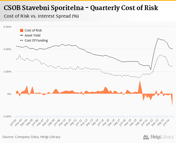 CSOB Stavebni Sporitelna's Cost of Risk (loan loss provisions as % of total assets) amounted to -1.04% in the fourth quarter of 2024, down from 0.014% when compared to the previous quarter.
