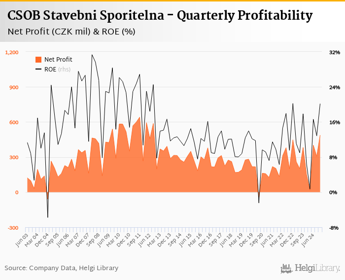 CSOB Stavebni Sporitelna made a net profit of CZK 488 mil in the fourth quarter of 2024, up 223% when compared to the same period of last year. This implies a return on equity of 20.2%.