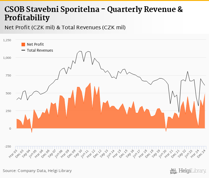 CSOB Stavebni Sporitelna made a net profit of CZK 488 mil under revenues of CZK 604 mil in the fourth quarter of 2024, up 223% and 38.5% respectively when compared to the same period last year.