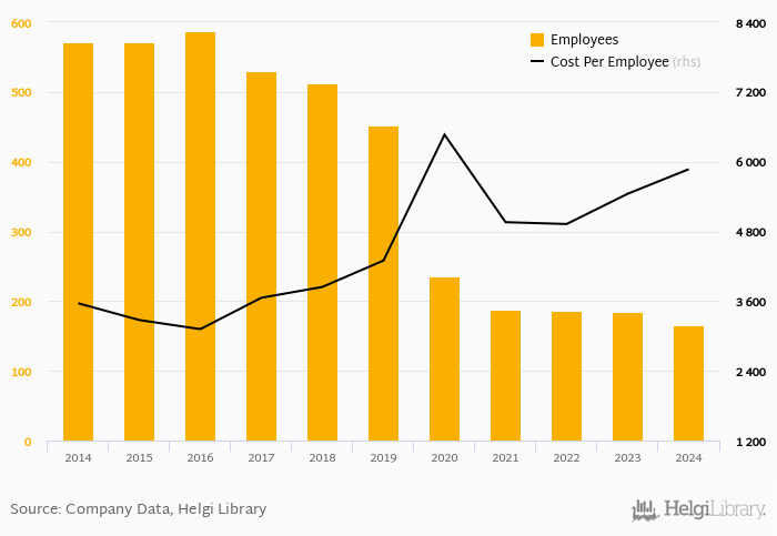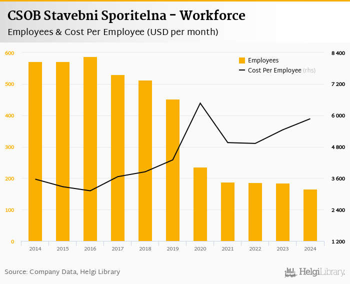 CSOB Stavebni Sporitelna employed 165 persons in 2024, down 10.3% when compared to the previous year. Historically, the bank's workforce hit an all time high of 587 persons in 2016 and an all time low of 165 in 2024.