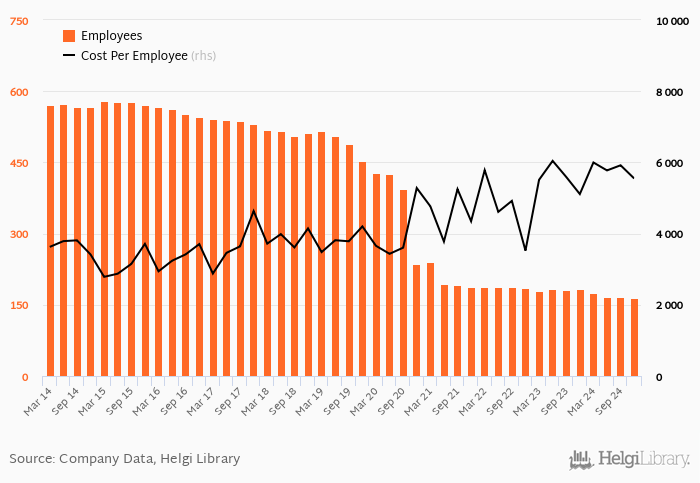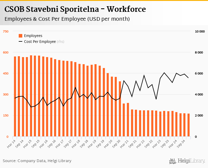 CSOB Stavebni Sporitelna employed 165 persons in 2024-12-31, down 1.20% when compared to the previous year. Historically, the bank's workforce hit an all time high of 580 persons in 2015-03-31 and an all time low of 165 in 2024-12-31.