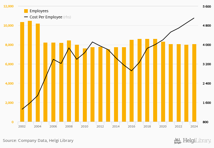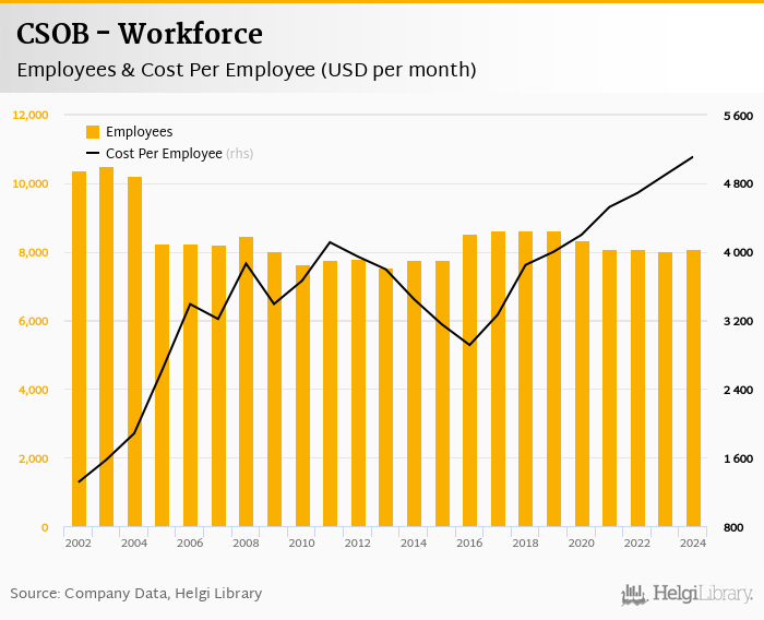 CSOB employed 8,075 persons in 2024, up 0.485% when compared to the previous year. Historically, the bank's workforce hit an all time high of 10,511 persons in 2003 and an all time low of 7,553 in 2013.