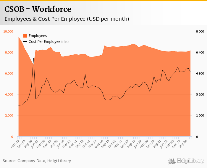 CSOB employed 8,144 persons in 2025-03-31, up 0.854% when compared to the previous year. Historically, the bank's workforce hit an all time high of 9,429 persons in 2005-03-31 and an all time low of 6,750 in 2006-12-31.