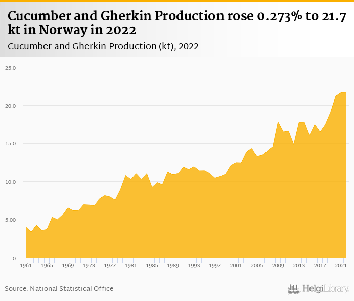 Cucumber and gherkin production rose 0.273% to 21.7 kt in Norway in 2022, according to Faostat.