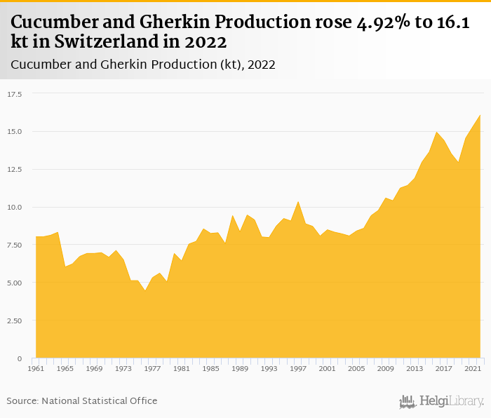 Cucumber and gherkin production rose 4.92% to 16.1 kt in Switzerland in 2022, according to Faostat.