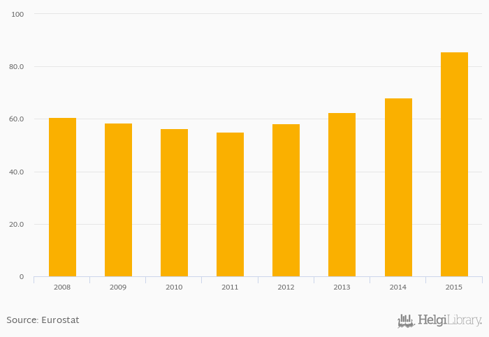 Cultural Employment - From 50 to 59 years ('000 persons) rose 26.0% to 85.7 '000 in Spain in 2015, according to Eurostat.