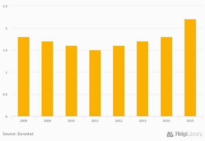 Cultural Employment - From 50 to 59 years (As % of Total Employment) rose 22.2% to 2.20% in Spain in 2015, according to Eurostat.