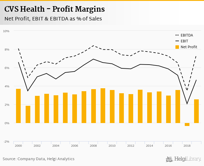 CVS Health made a net profit of USD 6,634 mil with revenues of USD 256,776 mil in 2019, up by 1.00% and up by 32.0%, respectively, compared to the previous year.