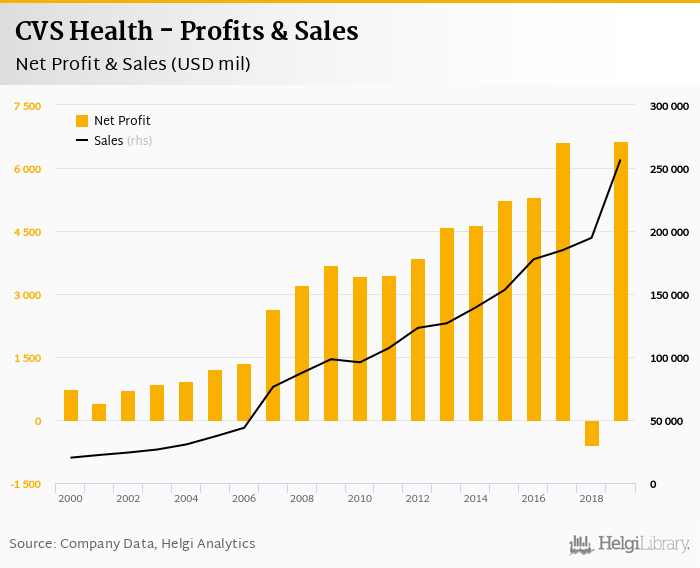 CVS Health made a net profit of USD 6,634 mil in 2019, up 1% compared to the previous year. Total sales reached USD 256,776 mil, which is up 32% when compared to the previous year.