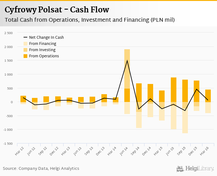 Cash from financing amounted to PLN -372 mil, so the company generated PLN 50.0 mil net cash in 1Q2016.