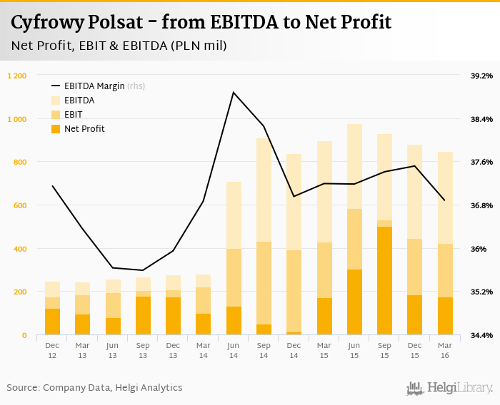 Cyfrowy Polsat made a net profit of PLN 176 mil with revenues of PLN 2,364 mil in 1Q2016, down by 5.44% and down by 9.42%, respectively, compared to the previous year. This translates into a net margin of 11.8%.