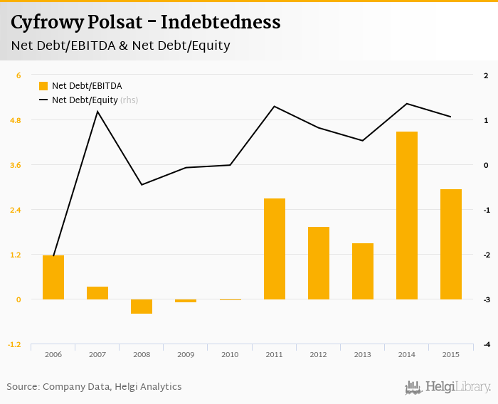 Cyfrowy Polsat's net debt stood at PLN 10,851 mil and accounted for 1.06 of equity at the end of 2015. The ratio is down 0.295 pp compared to the previous year.