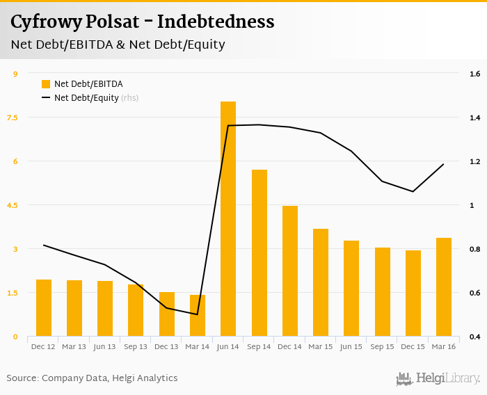 Cyfrowy Polsat's net debt stood at PLN 12,331 mil and accounted for 1.19 of equity at the end of 1Q2016. The ratio is down 0.142 pp compared to the previous year.