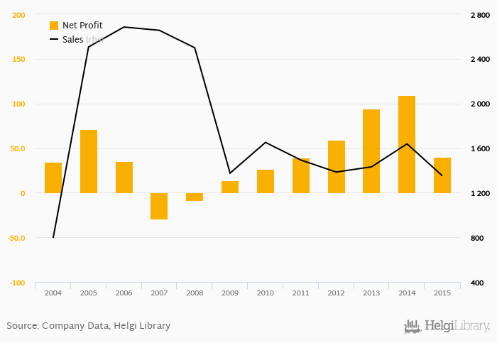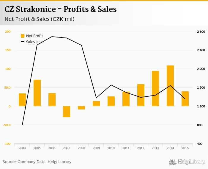 CZ Strakonice made a net profit of CZK 39.7 mil in 2015, down 63.7% compared to the previous year. Total sales reached CZK 1,351 mil, which is down 17.5% when compared to the previous year.