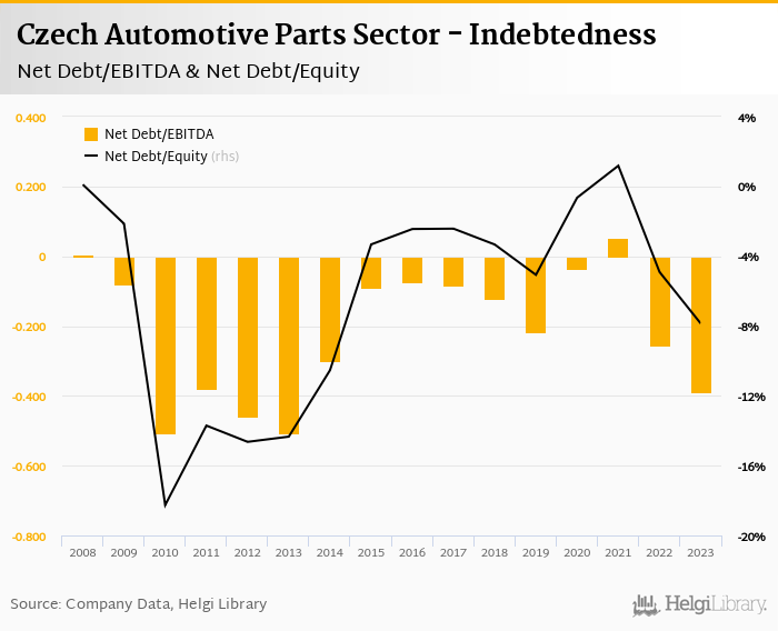 Czech Automotive Parts Sector's net debt stood at CZK -11,510 mil and accounted for -7.85% of equity at the end of 2023. The ratio is down 2.95 pp compared to the previous year.