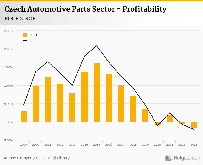 Czech Automotive Parts Sector made a net profit of CZK -3,062 mil in 2023, down 213% compared to the previous year. Historically, between 2009 and 2023, the company's net profit reached a high of CZK 25,299 mil in 2015 and a low of CZK -3,062 mil in 2023.