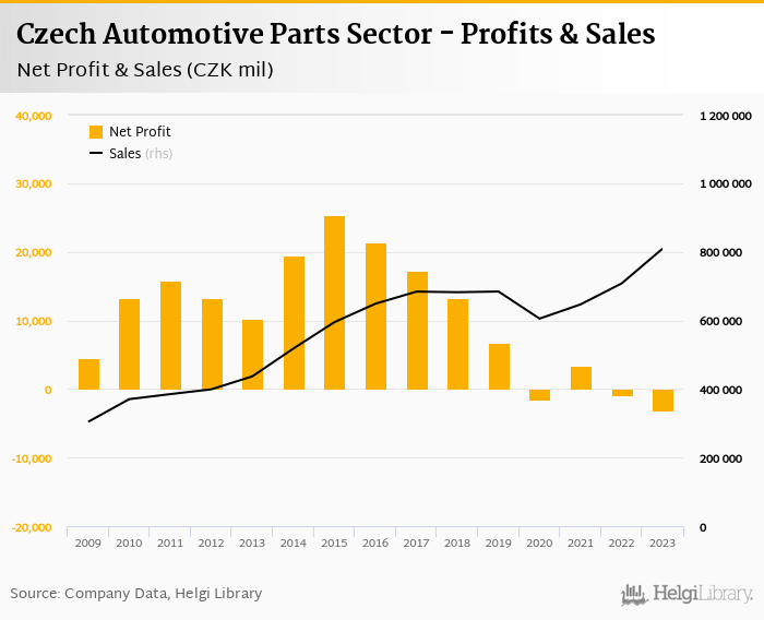 Czech Automotive Parts Sector made a net profit of CZK -3,062 mil in 2023, down 213% compared to the previous year. Total sales reached CZK 809,401 mil, which is up 14.4% when compared to the previous year.