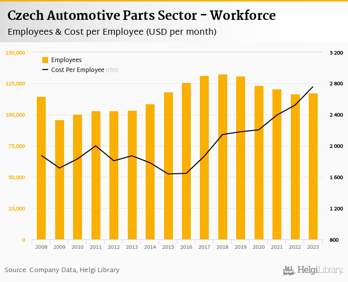 Czech Automotive Parts Sector employed 117,446 employees in 2023, up 0.675% compared to the previous year. Historically, between 2008 and 2023, the firm's workforce hit a high of 132,586 employees in 2018 and a low of 95,820 employees in 2009.