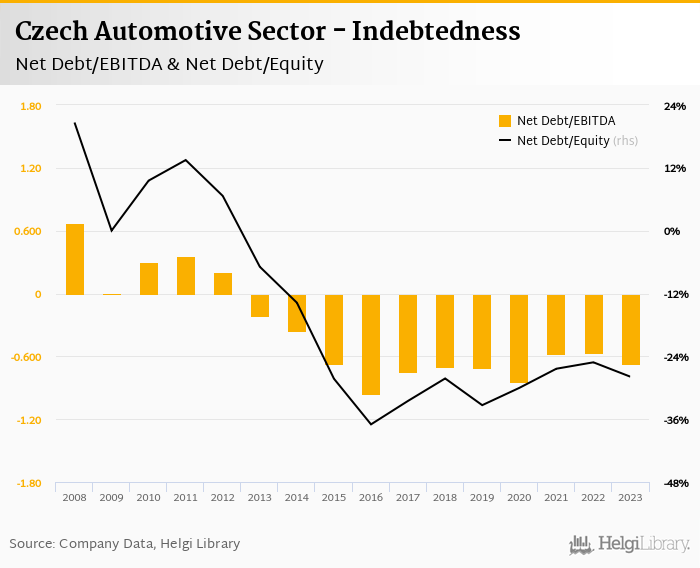 Czech Automotive Sector's net debt stood at CZK -45,809 mil and accounted for -27.9% of equity at the end of 2023. The ratio is down 2.75 pp compared to the previous year.