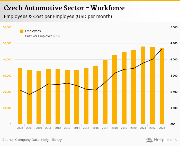 Czech Automotive Sector employed 47,302 employees in 2023, down 0.784% compared to the previous year. Historically, between 2008 and 2023, the firm's workforce hit a high of 48,009 employees in 2021 and a low of 33,140 employees in 2010.