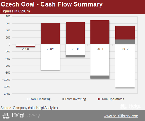 Czech Coal's sales reached nearly CZK 13 bil in 2012, up from CZK 7.6 bil in 2004. The net profit dropped to CZK 668 mil in 2012, down from nearly CZK 3.3 bil in 2009