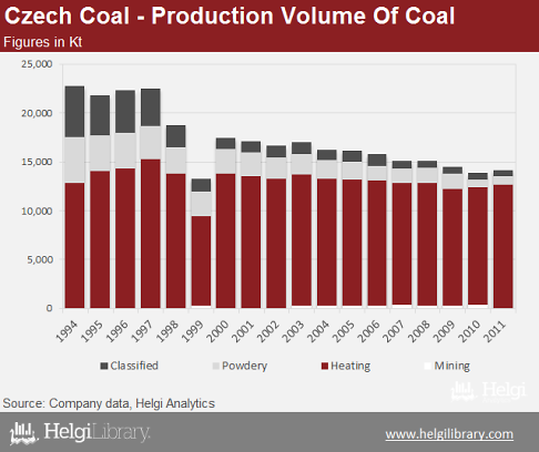 Extraction of lignite has been declining in the Czech Republic. From nearly 23 mil tonnes of coal extracted by Czech Coal in 1994, the amount reached 14.2 mil in 2011, down 38%.